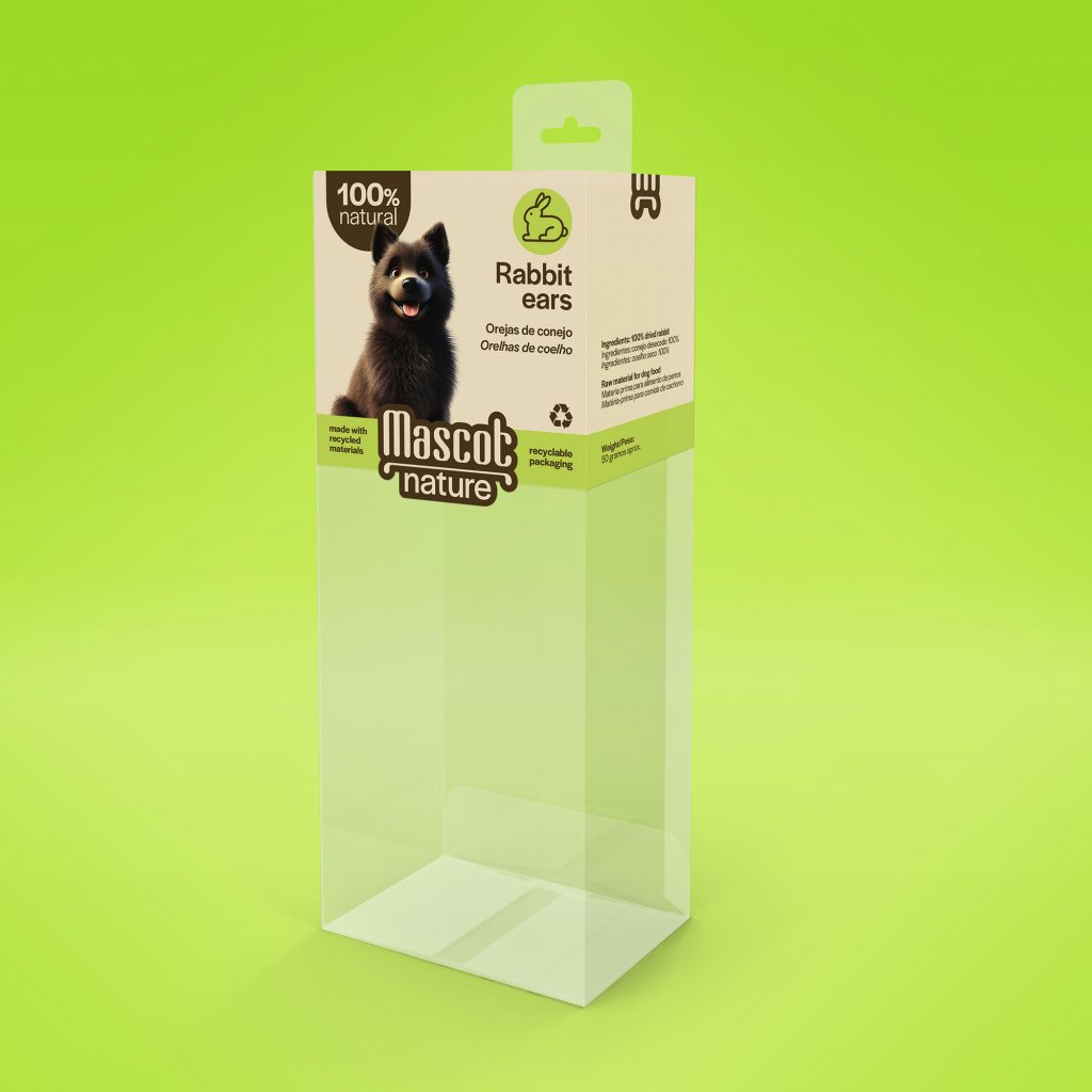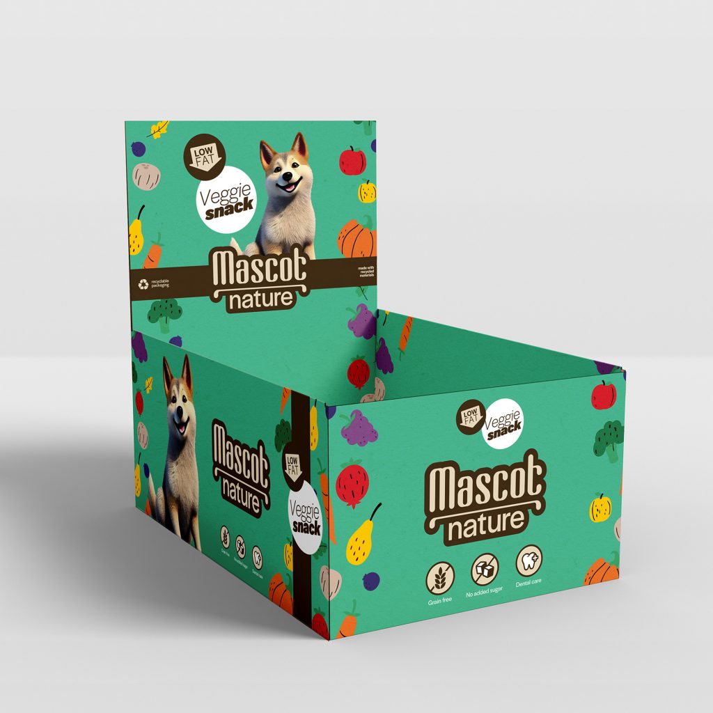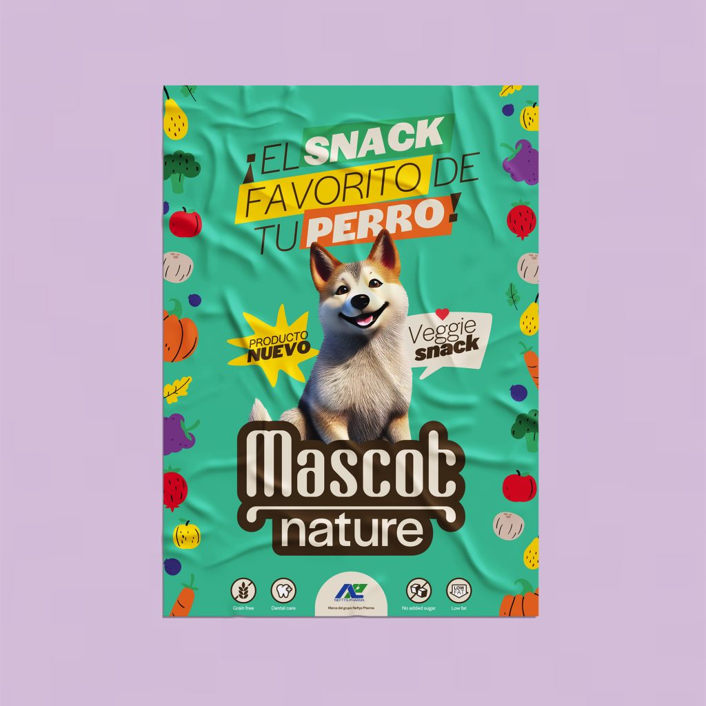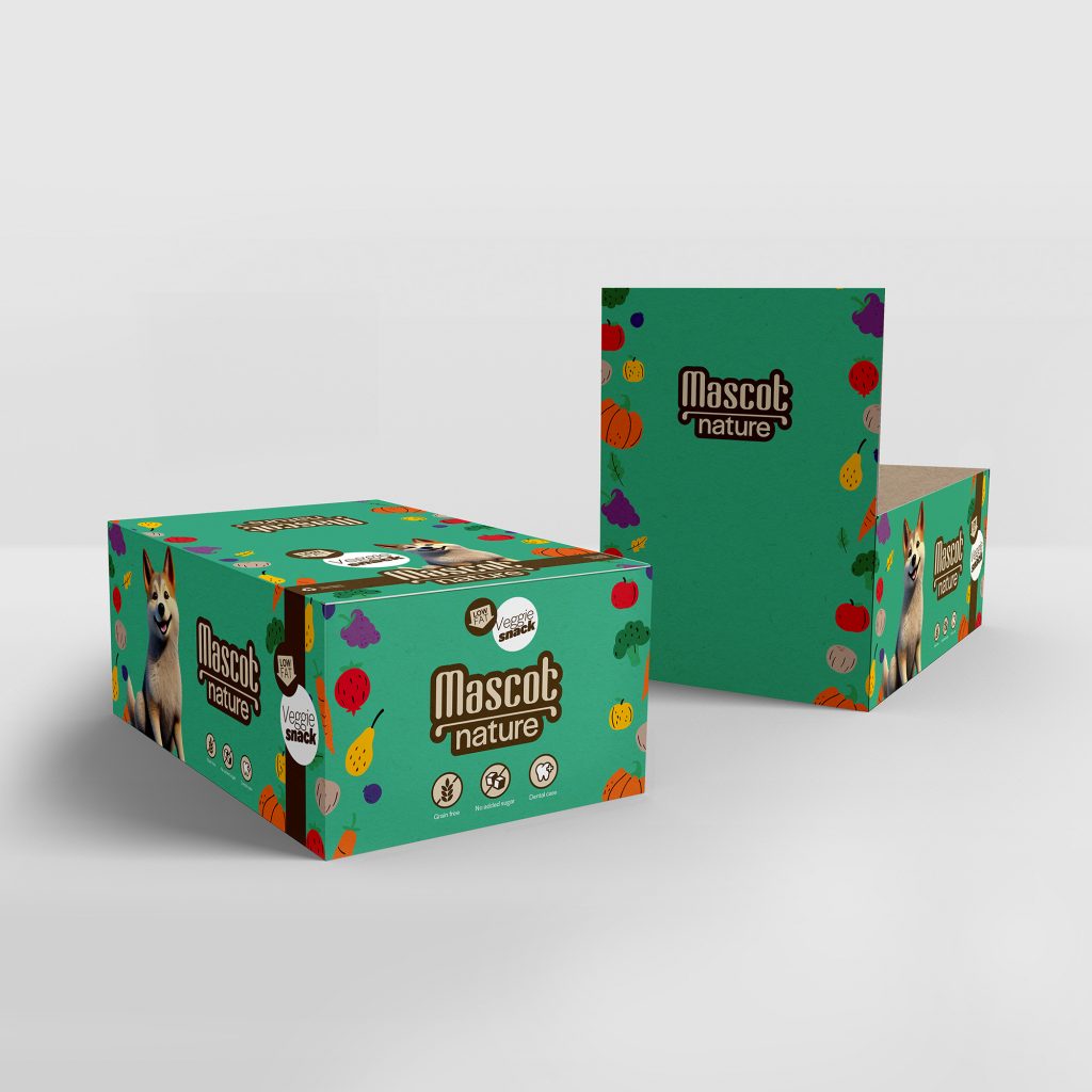 Mascot Nature és una marca de snacks naturals per a gossos. S’han creat les etiquetes per als blísters adients a la imatge corporativa, incloses les il·lustracions fetes amb IA i tota la iconografia. Per altra banda, s’ha creat un packaging per a un producte nou: snacks vegans a granel. S’ha dissenyat la caixa contenidora del producte, així com la il·lustració del gos feta amb IA i la resta d’elements fets originalment.